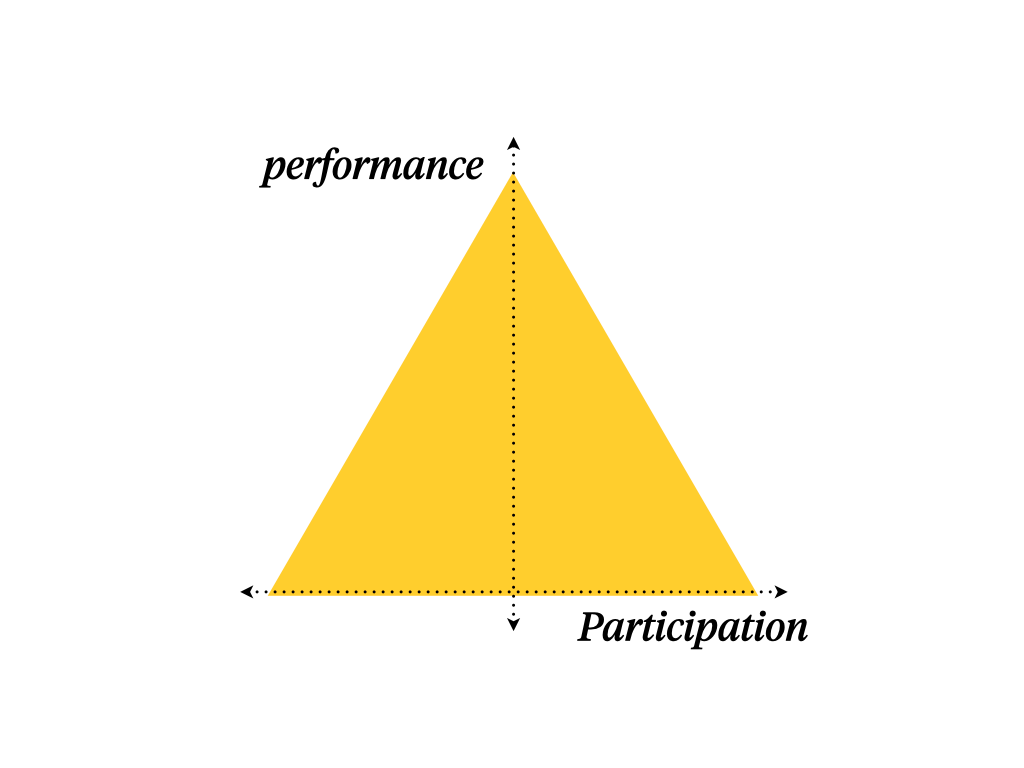 This pyramid has two dimensions. The height represents performance - the extent to which competition and winning is the point. The width represents participation - a spectrum from activities that almost everybody can do, through to things that are limited to an exclusive group.